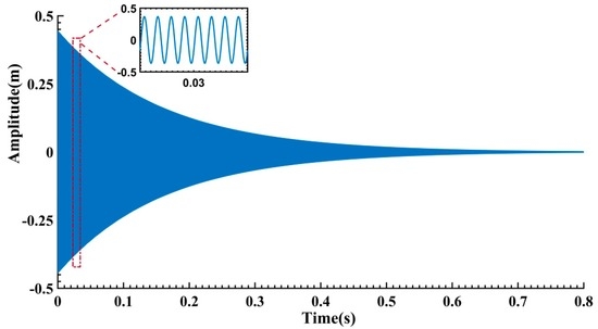 A high frequency and low damping Duffing system is taken as an example, where m is 10−7 kg, and is 1.257 × 10−6 N/(m/s) independent of the vibration amplitude. is vibration amplitude-dependent and equals to 1.579 × 103 × (1 − 0.002x2) N/m to give a “softened-spring” nonlinearity. B, , t1 are set to be 0.1 N, 20 kHz and 1.5 s respectively. The sampling frequency and the simulation time are set to be 1 MHz and 3 s, respectively. With the aid of the ode45 solver in Matlab, the time series of the system response is numerically calculated as shown in Figure 1. Evidently, in the forced vibration stage, the signal amplitude gradually turns into a relatively steady state after a transition of regular increase and fluctuation. As the amplitude fluctuation rate during 0.7–0.8 s is less than 0.5%, it is appropriate to assume that the vibration enters into the steady-state after that. Additionally, after the excitation is ceased for about 0.8 s, the free damped oscillation amplitude is reduced from 0.33 m to 2.16 × 10−3 m. Therefore, the duration time of both the excitation and the sampled free damped oscillation are set to be 0.8 s in the following analysis, unless otherwise indicated.