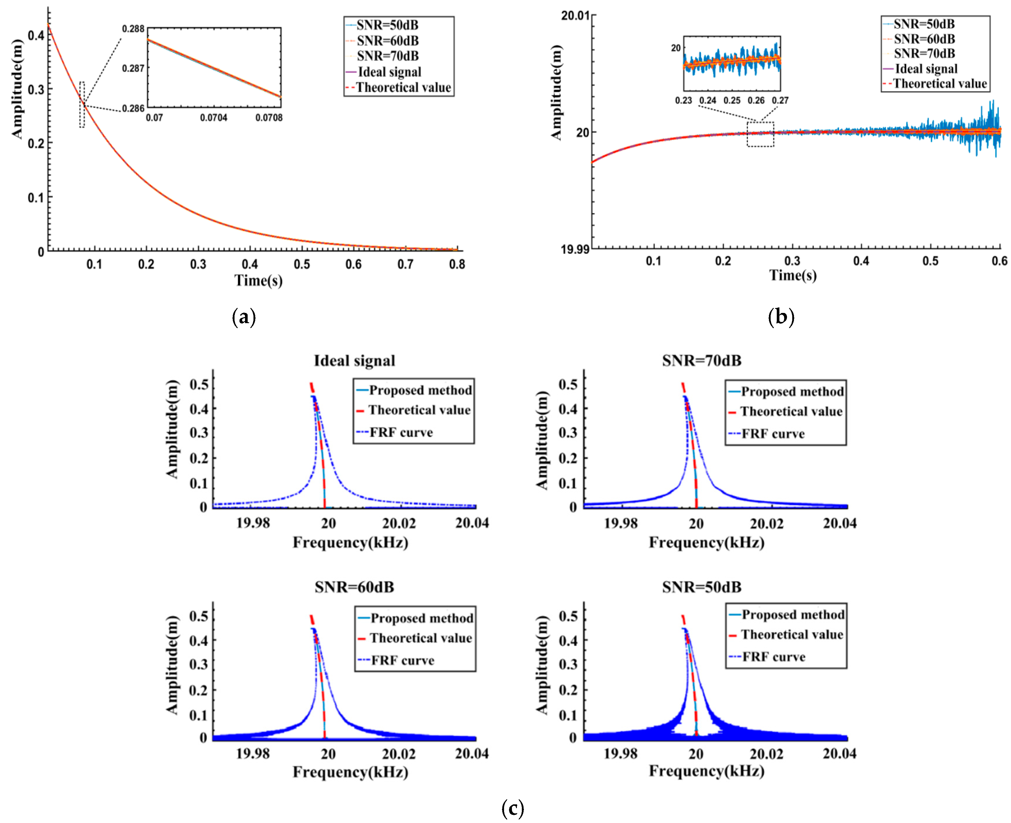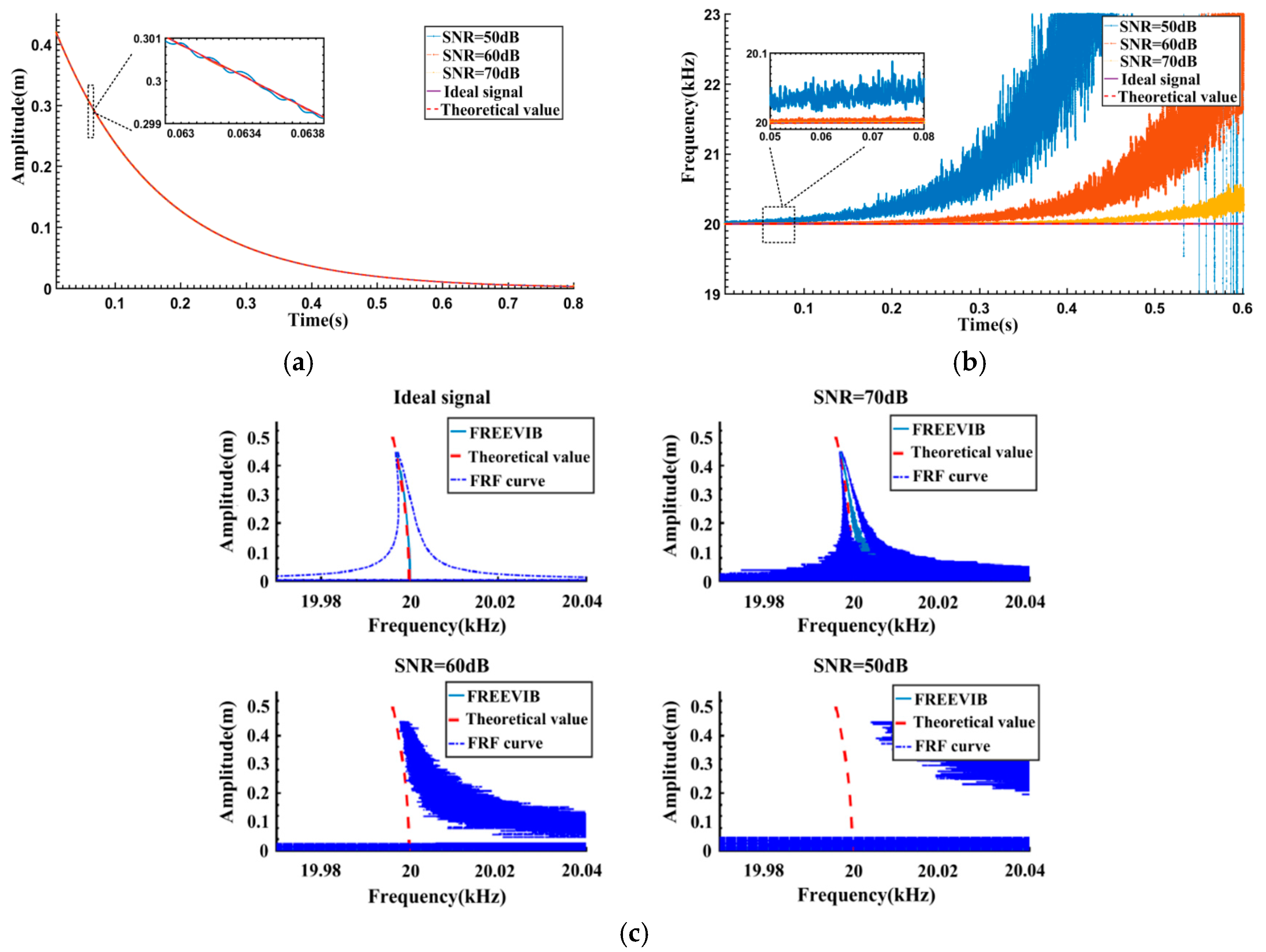 In order to simulate practical measurements, white noise is added into the free vibration signal to obtain noisy signals with different SNRs. The results calculated by FREEVIB are given in Figure 4. It can be seen from Figure 4a,b that, along with the decrease of SNR, the variation of the IAs is almost negligible. However, the IFs fluctuate severely and gradually deviate from the theoretical value. Correspondingly, as can be seen from Figure 4c, FREEVIB could accurately extract the Backbone curve from the ideal signal, and the calculated FRF curve is both regular and legible. When the SNR is 70 dB, the upper part of the Backbone curve agrees well with the theoretical value. However, there is a certain offset at the bottom of the Backbone curve and a remarkable fluctuation of the FRF curve. As SNR is reduced to 50 dB, an overall and significant deviation is observed in the results. The FREEVIB algorithm fails to describe the actual dynamic behavior of the system.