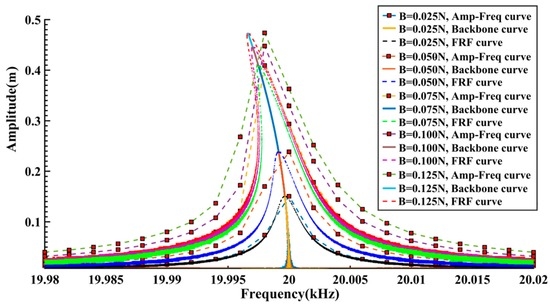 in Figure 2a. After truncation and noise addition, five segments of free vibration signals with 60 dB SNR are processed by the proposed algorithm and the results are given in Figure 6. It can be seen that, in the case of lower excitation amplitude (B = 0.025 N, 0.05 N), almost no visible nonlinearity appears both in the Backbone curves and FRF curves, indicating that the system is operating in the approximately linear region. With the increase of excitation amplitude (B = 0.075 N–0.125 N), the nonlinear features in the Backbone curves and FRF curves become significant. Moreover, the variation tendencies of both the Backbone curves and FRF curves indicate the “softened-spring” characteristics of the system.