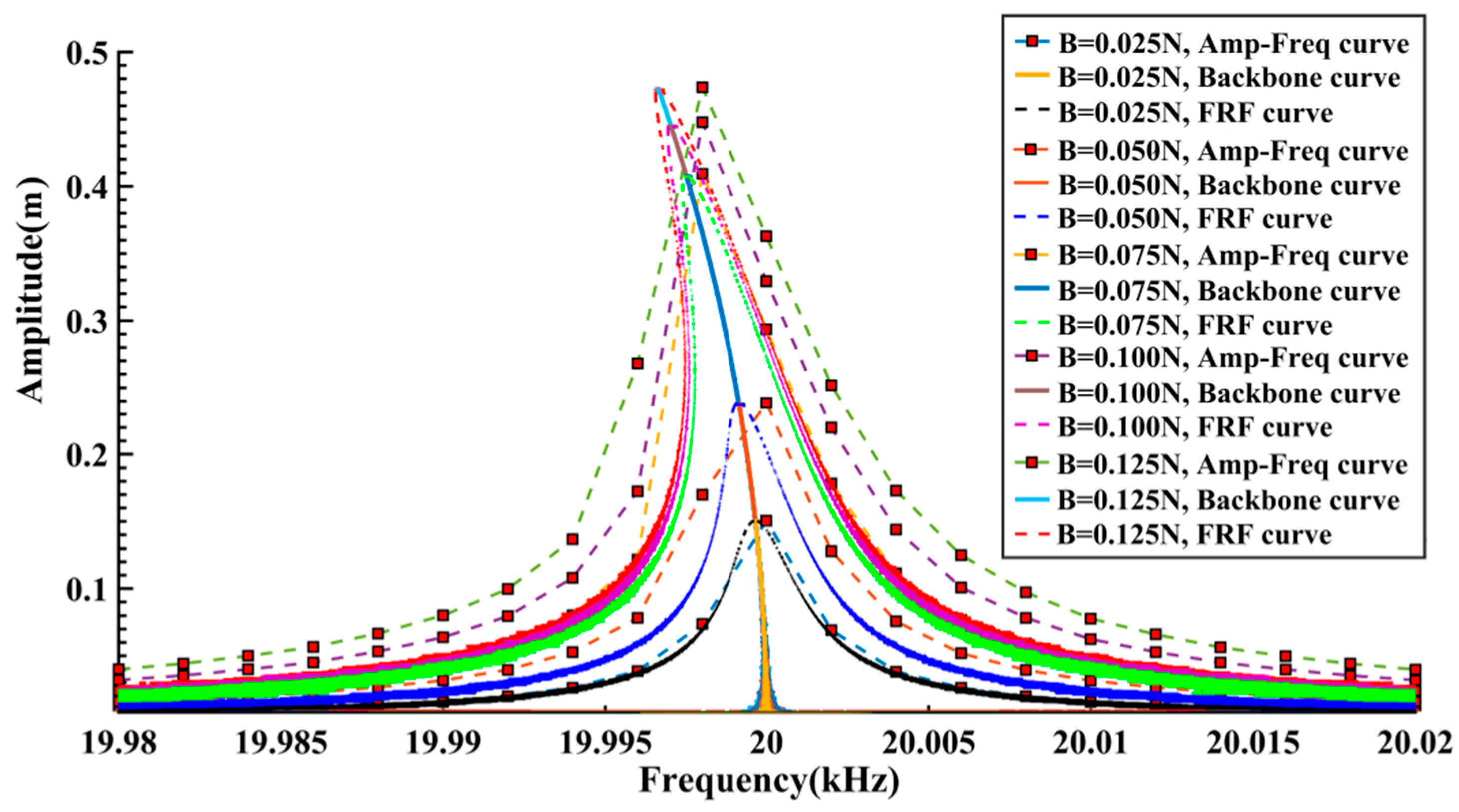 In order to perform a comparison, the Backbone curves and FRF curves under different excitation conditions are also summarized in Figure 6. The amplitude-frequency curves in Figure 2 are given as well. It can be seen that the calculated Backbone curves and FRF curves show good consistency. The amplitude-frequency curves, on the other hand, differ slightly from the FRF curves. This difference may be caused by the relatively larger frequency intervals as well as the fact only approximate steady-state data are used for the calculations. In any case, the shapes of the amplitude-frequency curves are still in good agreement with the FRF curves.