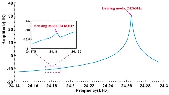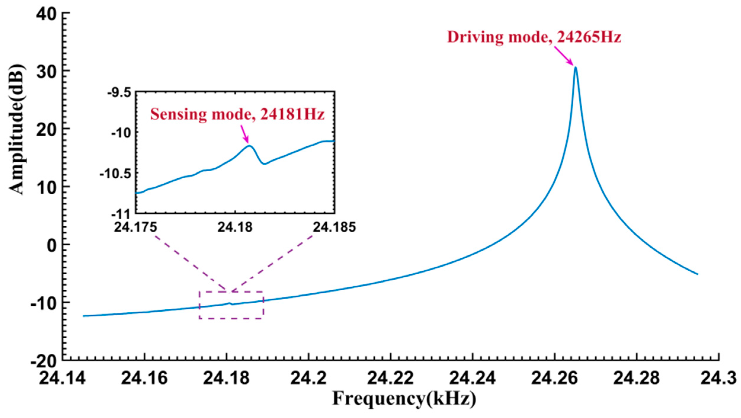 A MEMS vibrating ring gyroscope developed by our laboratory [20] was experimentally tested. Its resonator structure and working principle are similar to those reported in [21,22,23,24,25]. The resonator is a suspended ring that works in its fundamental flexural mode. In operation, the ring is electrostatically driven and its vibration is capacitively picked up by the sensing electrodes (45° from the driving electrodes). The resonator is encapsulated in a low-pressure metallic package, and the Q factor is approximately 20,000. Due to the imperfections in the bulk silicon manufacturing process, there is an obvious frequency split of about 100 Hz in the practically fabricated gyroscopes. For the one under test, the amplitude-frequency response curve of the driving mode is presented in Figure 7. Its natural frequency of the sensing mode is 24,181 Hz, but that of the driving mode is 24,265 Hz. In our case, the resonator is tested near the resonant frequency of the driving axis, so the influence of the sensing mode is quite weak and negligible, and the free vibration can be considered as a mono-frequency oscillation of a SDOF system.
