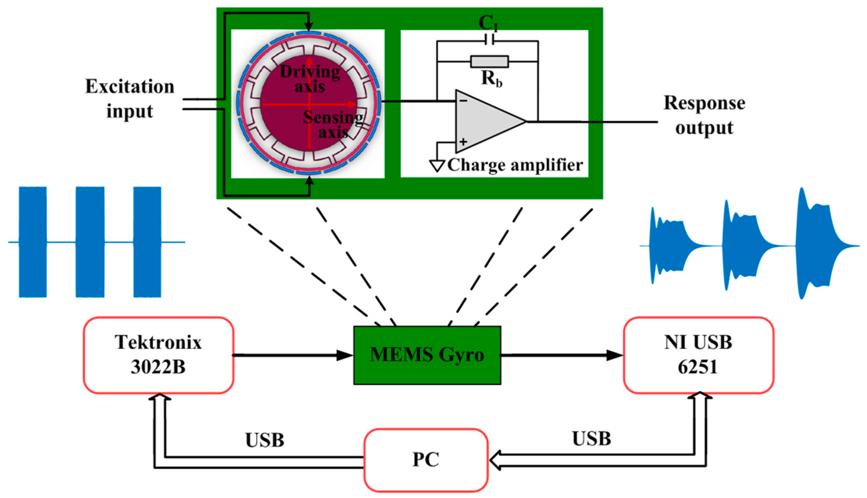 The schematic diagram of the testing system is shown in Figure 8. The output terminal of an AFG 3022B function generator (Tektronix, Beaverton, OR, USA) is connected to the driving electrodes. The vibration along the driving axis is driven by the generated excitation signals. The vibration along the sensing axis is picked up by the sensing electrodes and the charge amplifier to give the response output signal. Therefore, the vibration response amplitude is given in voltages instead of meters. A USB 6251 DAQ device (NI, Austin, TX, USA) is used to sample both the excitation and response signals synchronously. The sampled signals are transmitted to a computer through an USB interface for subsequent signal processing and analysis.