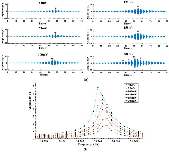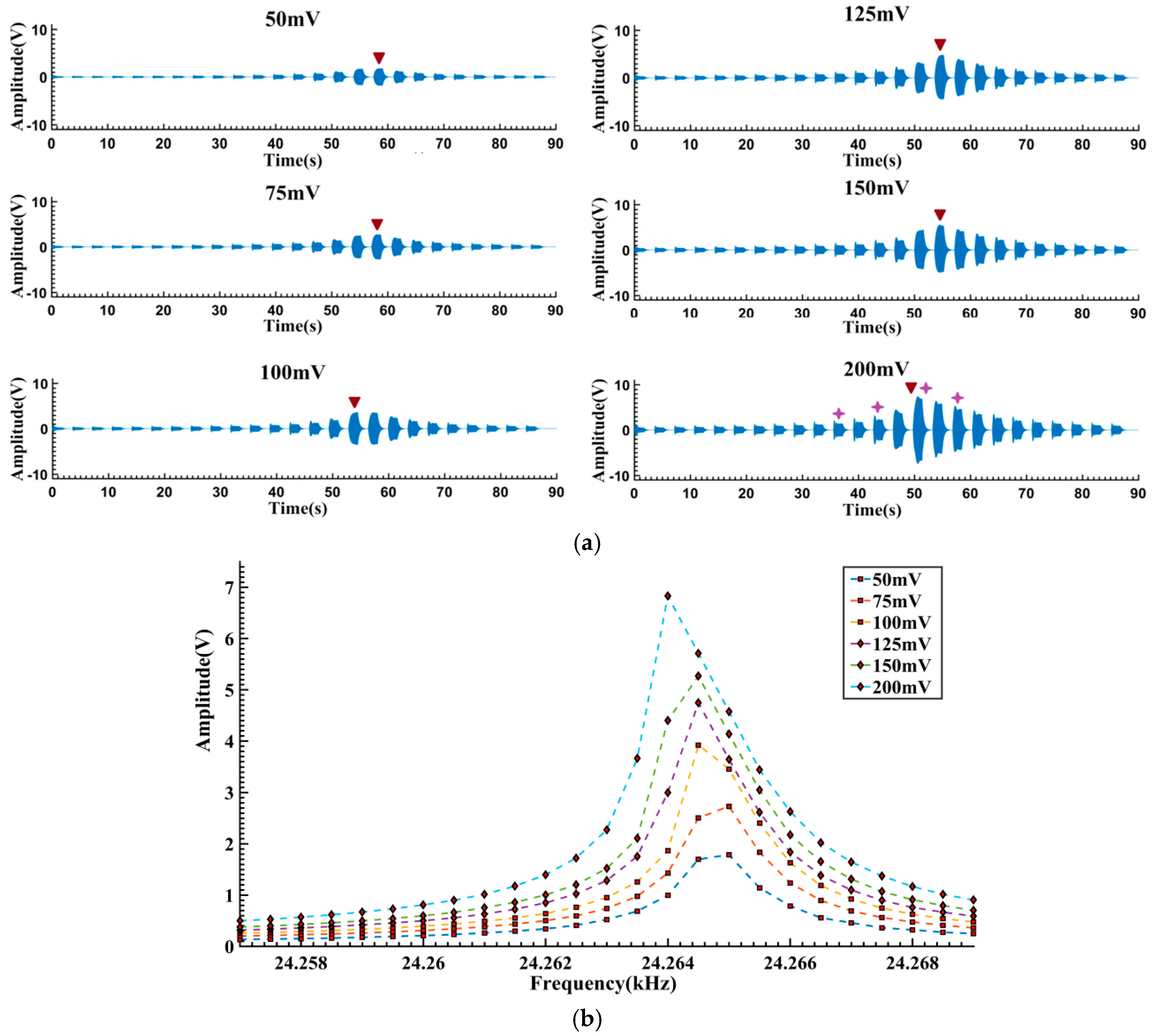 Response of the tested gyroscope under different excitation voltages: (a) Measured response signals; (b) Amplitude-frequency curves.