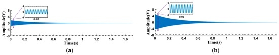 in Figure 9a) are truncated as shown in Figure 10. It can be seen that when the vibration amplitudes are relatively small (Figure 10a–e), the signal waveforms are vertically symmetrical and exponential decayed. However, when the vibration amplitudes exceed a certain level (about 6 V, indicated by the left arrow in Figure 10f), the asymmetry gradually becomes visible. This might be caused by the non-ideal structure of the micromachined resonator. Asymmetry of the fabricated structure leads to different dynamics characteristics when the resonator vibrates positively and negatively from the balance position. Therefore, the asymmetric data on the left side of the indicating arrow in Figure 10f are excluded to avoid the latent impact of waveform asymmetry.