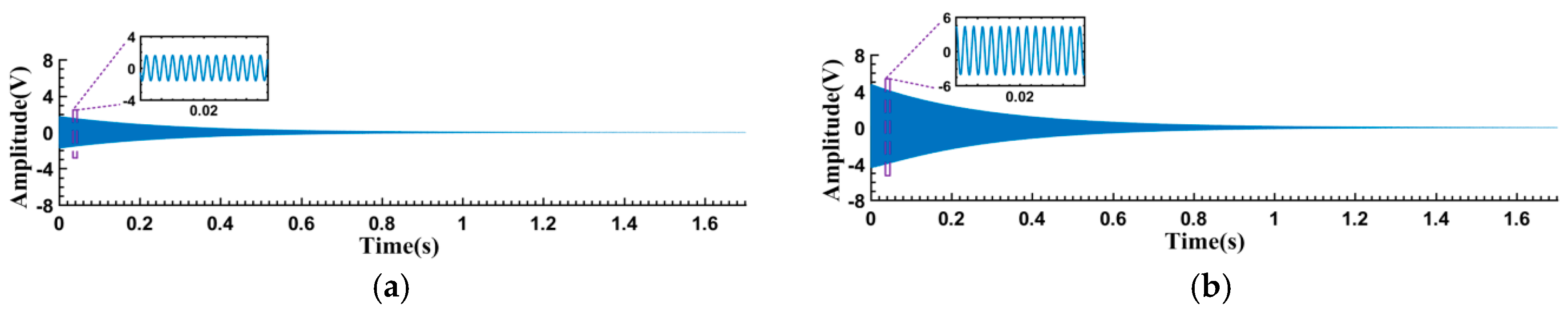 During experiments, a stair-stepped frequency sinusoidal pulse sequence is generated by the AFG 3022B and used as the excitation signal. The excitation frequency varies in a 0.5 Hz forward step within the range of 24.257–24.269 Hz. The amplitudes of the excitation signals are varied from 50 mV to 200 mV. Similar to the above mentioned simulations, the time durations of the forced and free damped oscillation are set to be 1.6 and 1.8 s, respectively. The sampling frequency is set to be 250 kHz (approximately 10 times the signal frequency).