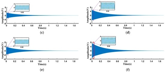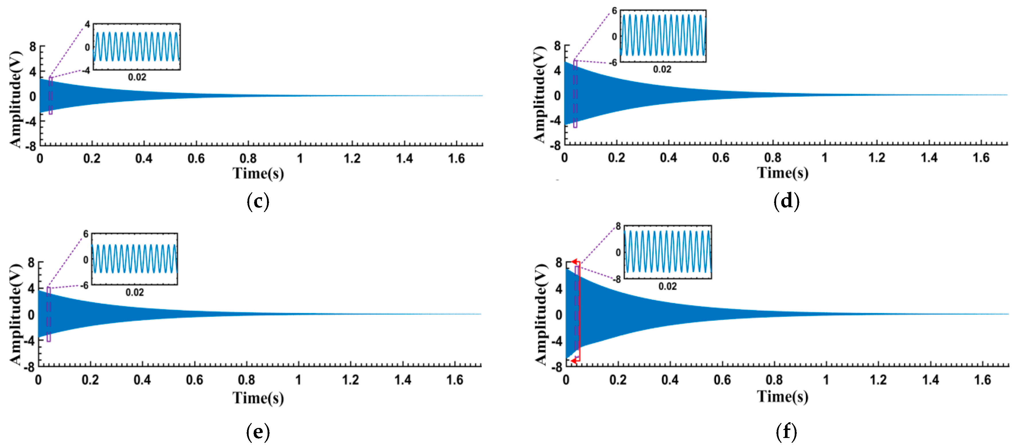 Free vibration signals of the largest response segments in Figure 9: (a) 50 mV; (b) 75 mV; (c) 100 mV; (d) 125 mV; (e) 150 mV; (f) 200 mV.