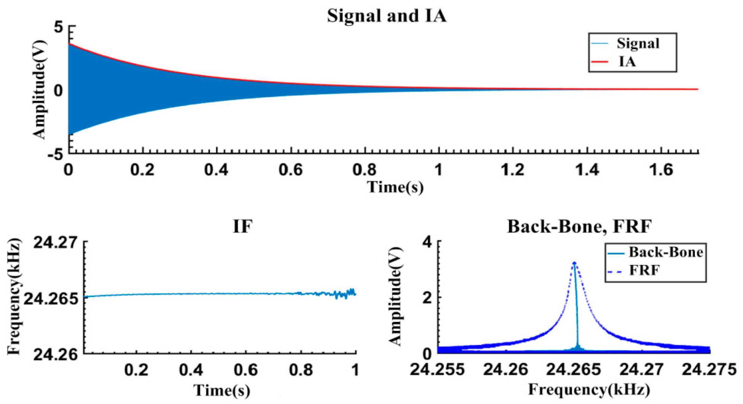 The free vibration signals in Figure 10 are processed by the proposed method. The results are shown in Figure 11. As an example, Figure 11 gives the detailed results of Figure 10c. Both the calculated IA and IF curves are satisfactorily smooth. Correspondingly, the calculated Backbone curves and FRF curves are concentrated and legible, and can be used for characterizing the dynamic features. Six sets of the extracted Backbone and FRF curves are given in Figure 12. When the maximum response amplitudes are below 3 V, the Backbone curves are approximate plumb lines and the FRF curves are bilaterally symmetrical, indicating that the resonator is vibrating linearly. As the maximum amplitudes increase to 4–6 V, the Backbone curves gradually bend to the left. In addition, “softened-spring” features are also exhibited in the FRF curves.