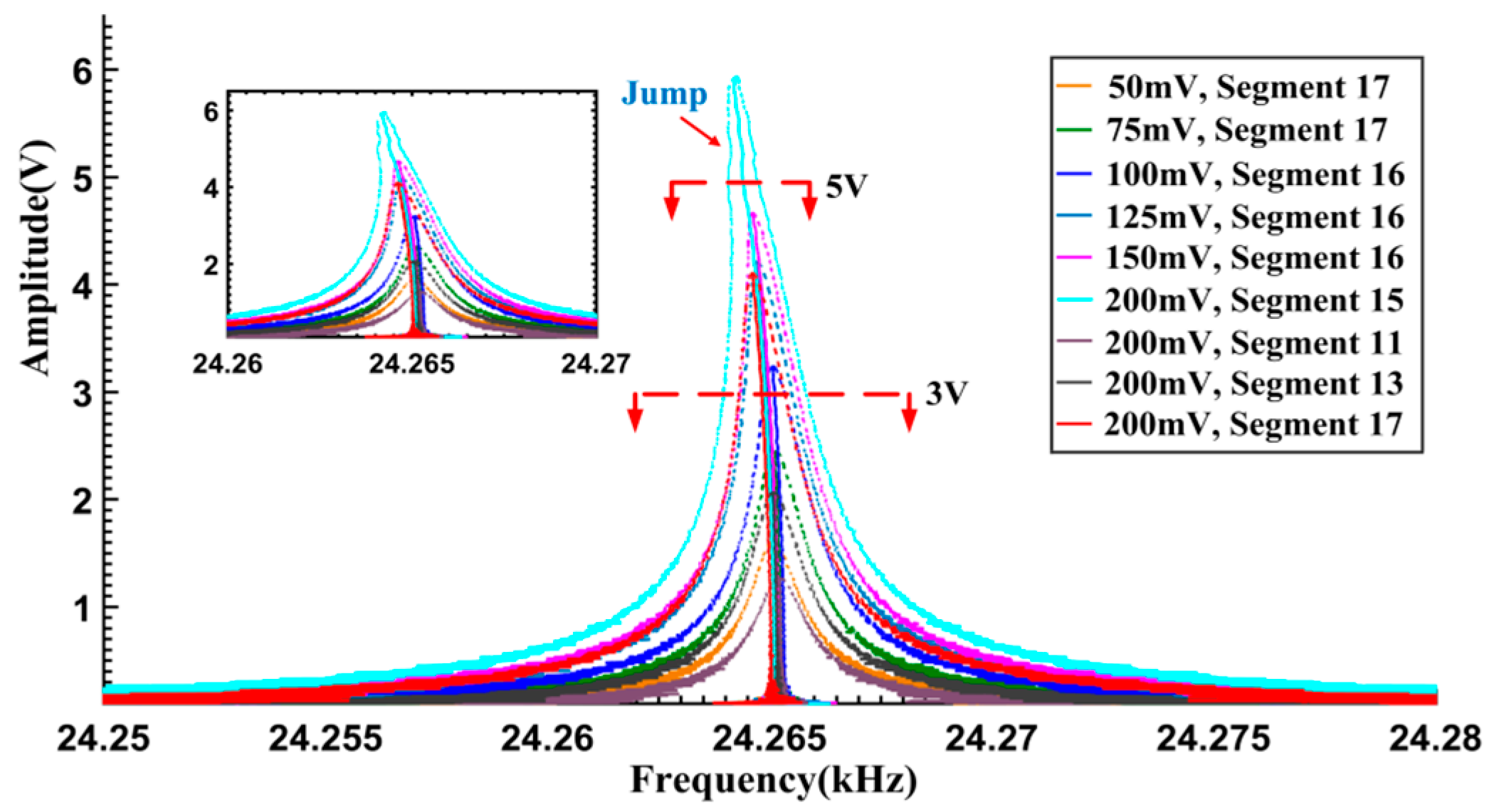 in Figure 9a), and relatively smaller amplitudes are observed in other positions. When the excitation voltage exceeds 100 mV, the resonant frequencies shift leftwards and bilateral asymmetrical shapes appear, revealing the “softened-spring” characteristics of the tested gyroscope.