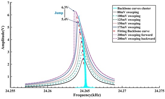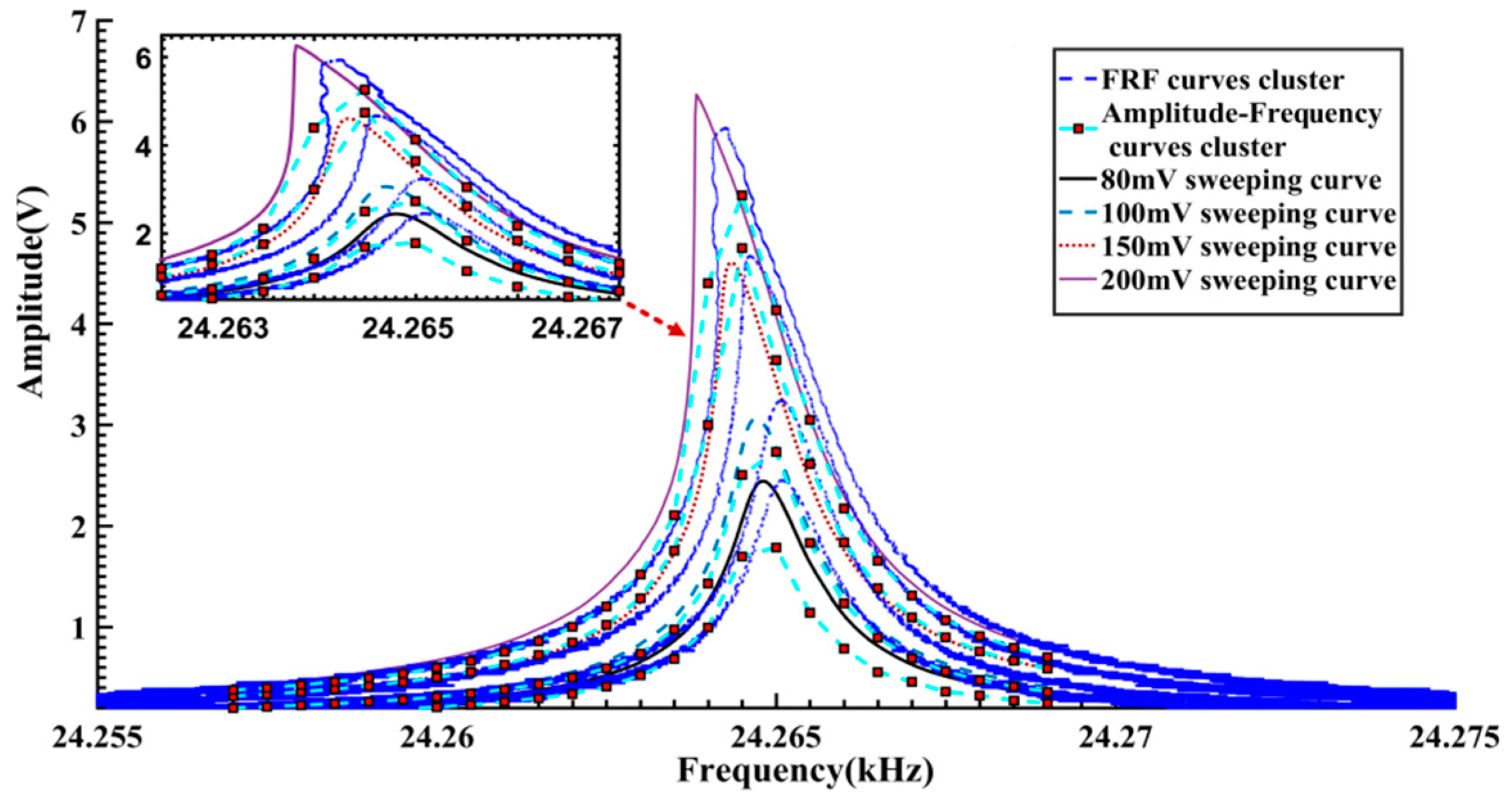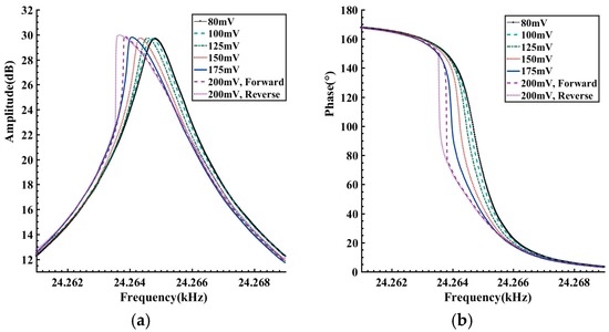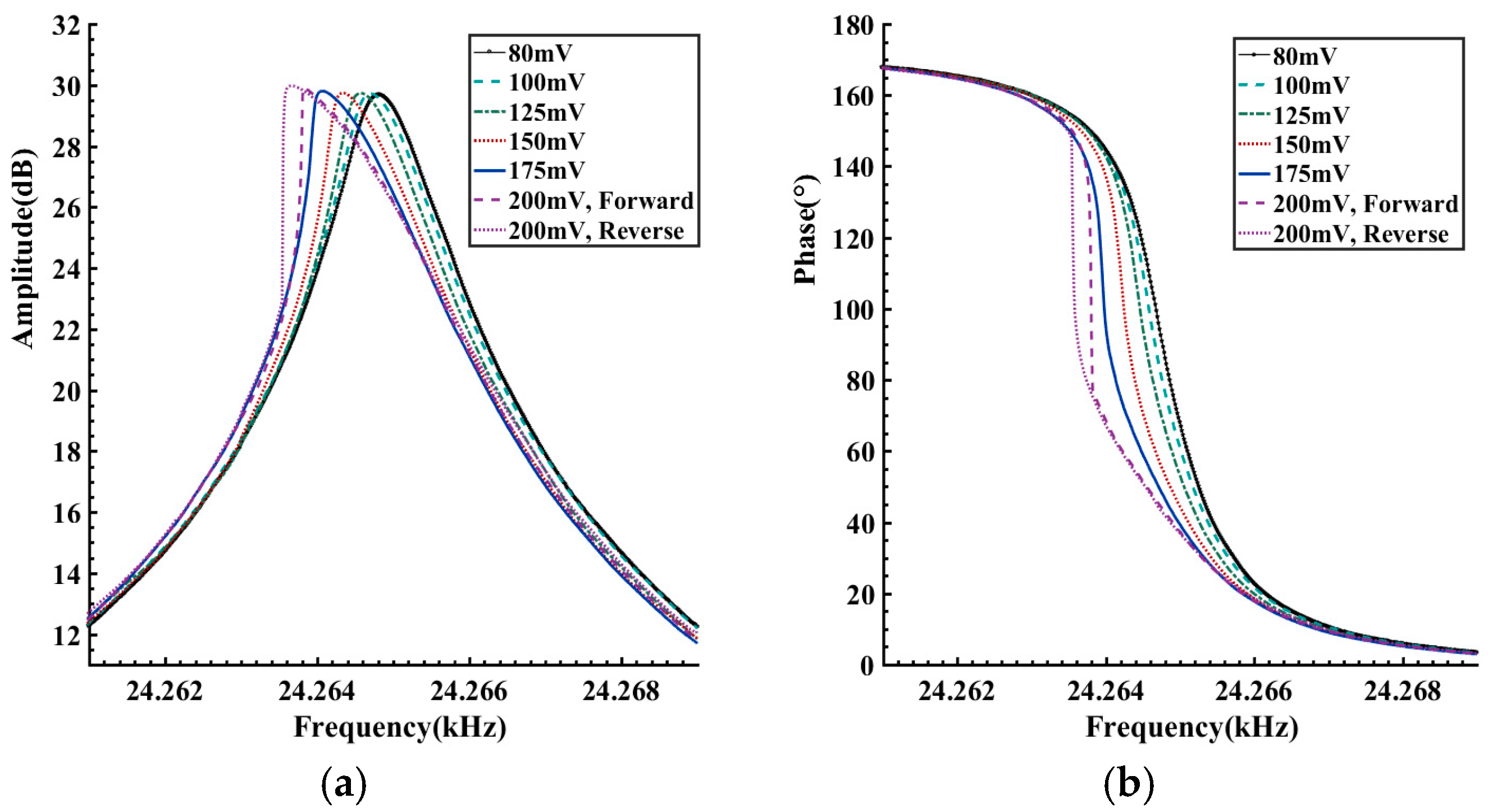 In order to verify the abovementioned results, a frequency sweeping method is employed to acquire the dynamic characteristics of the tested gyroscope. A HP35670A dynamic signal analyzer (Agilent, Santa Clara, CA, USA) is used in the experiments. The excitation voltages are assigned to six values in the 80–200 mV range. Within the range of 24,257–24,269 Hz, a forward and reverse frequency sweeping operation is conducted. The frequency step and the holding time are set to be 0.01 Hz and 1.5 s. The measured frequency response curves are given in Figure 13.