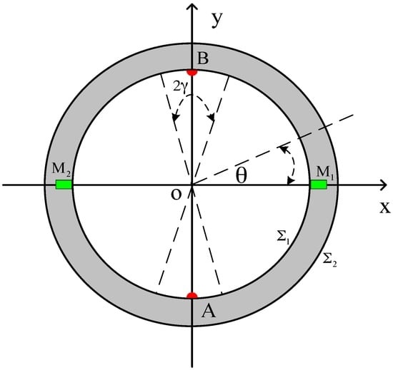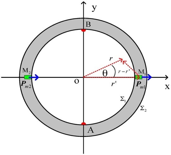 Figure 2 shows a schematic diagram of the downhole inserted two-electrode EMF, A and B represent two electrodes placed on the inner wall at intervals of 180° inside the flowtube, M1 and M2 represent two magnetic dipoles inlaid on the wall of the flowtube at intervals of 180°, and and represent the inner and outer surfaces of the EMF, respectively.