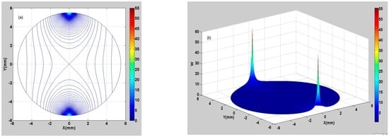 We can easily verify that the formula satisfies Laplace’s equation by substituting Equation (11) into Equation (2). Furthermore, to determine the coefficients , , , and in Equation (11), we employ the solution below.