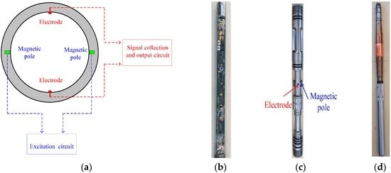 Production profile logging is a significant methodology in oilfield development, which can provide crucial information—such as oil-water output, temperature, and pressure—to evaluate reservoirs and identify high-aquifer potential through the placement of logging instruments in oil wells. Production profile logging is also useful for optimizing reservoir engineering plans and evaluating fracturing and water plugging effects. Over the past 30 years, the turbine flowmeter has been widely used for the production profile logging at Daqing Oilfield. In recent years, with the applications of enhanced oil recovery technologies, such as mass fracturing and chemical flooding, the flow of fluid in oil wells is much more complicated with fluids carrying sand and solid impurity concentration in the wellbore. Turbine flowmeters are frequently blocked by the rotating blades during logging, leading to measurement failure. Therefore, it is of important practical significance to develop downhole flowrate measurement technology with no moving parts and high reliability to further improve the success rate of well logging. The EMF is widely used to measure the injection rate in polymer-injection wells at Daqing Oilfield and is unaffected by temperature, viscosity, density, pressure, gravity, and other physical parameters of the liquid []. Inspired by successful utilization of EMF in polymer-injection wells, it is reasonable to believe that oil-water two-phase flow can be measured by the EMF in high-water-cut oil-producing wells.
