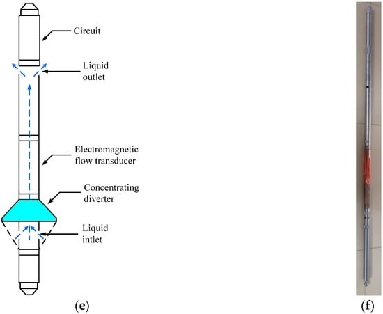 Figure 6a shows a diagram of the measuring principle of the EMF, the excitation circuit producing the magnetic field, and the signal collection circuit measuring the induction electromotive force, which is converted to a frequency signal through the signal output circuit; hence, the response frequency of the transducer is proportional to the flowrate. Figure 6b shows a photo of the EMF measuring circuit, Figure 6c shows a photo of the EMF transducer, Figure 6d shows a photo of the concentrating diverter, Figure 6e shows a diagram of the downhole EMF, and Figure 6f shows a photo of the downhole EMF.