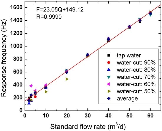 We conduct experiments on oil-water two-phase flow by EMFs No. 1 and No. 2 in the multiphase flow loop facility. We also study the response characteristics of the EMFs in oil-water two-phase flow. Figure 8 and Figure 9 show the linear fitting chart of EMFs No. 1 and No. 2, respectively. The abscissa and ordinate represent the standard flowrate and instrument response frequency, respectively. The standard flowrate represents the flowrate controlled and metered by the adjustment devices and measuring instruments under each flow condition. For each standard flowrate, we calculate the average response frequency of six flow conditions and then conduct linear fitting on the average response frequency (as shown in Figure 8 and Figure 9 by the red line). The correlation coefficients of the two EMFs are 0.9990 and 0.9986, respectively.