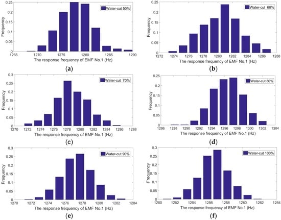 According to literatures [,], we analyze the measurement data. We find that the measurement data obey Gaussian behavior. An example has been added into the manuscript, as shown in Figure 10. The abscissa and ordinate represent the response frequency of EMF No. 1 and frequency, respectively. Figure 10a–f shows the distribution of the EMF No. 1 measurement data for different water-cuts at a constant flowrate of 50 m3/d. The mathematical expectations are 1278 Hz, 1280 Hz, 1279 Hz, 1296 Hz, 1278 Hz, and 1257 Hz, respectively. The variances are 11.6 Hz, 6.7 Hz, 6.2 Hz, 5.7 Hz, 3.2 Hz, and 2.8 Hz, respectively.