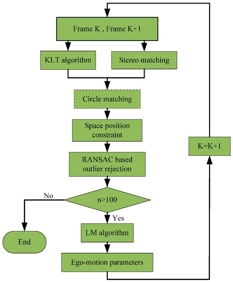 Figure 1 gives an overview of the approach in a tracking cycle. Firstly, the feature points and their optical flow are detected by using the Kanade–Lucas–Tomasi (KLT) algorithm [19]. The depth information of the feature points is obtained from the stereovision method detailed in our previous work [20]. To remove the outliers caused by KLT mismatching between the consecutive frames and stereo mismatching between left and right images, a circle matching is followed with. Since the circle matching is only conducted in the first frame of a tracking cycle, the block in the flowchart is marked with a dashed frame. The feature points selected by the KLT algorithm may contain a great deal of moving points, and must be filtered out for the minimization computation. To do so, a space position constraint (SPC) is imposed to discriminate between static points and moving points. Afterwards, the Random Sample Consensus (RANSAC) algorithm [21] is employed to further refine the feature point set, i.e., to eliminate the effects of outliers. The remaining feature points are fitted in the objective function and the Levenberg–Marquard (LM) algorithm [22] is used to solve for the six ego-motion parameters by minimizing the objective function.