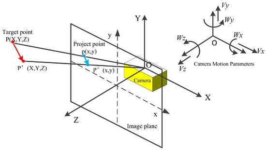 The camera’s 3-dimensional motion and planar imaging model is represented in Figure 2. The origin of the world coordinate system is located at the center of image coordinates , and the Z-axis is directed along the optical axis of the camera. The translational velocity of the camera is , and the rotational velocity .