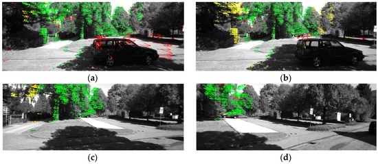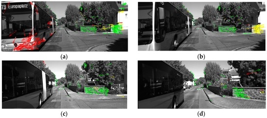 Figure 6 shows the results of one tracking cycle (frames 69–89) within scenario 2 after the circle matching process. As shown in Figure 6a, all the moving feature points on the car have been rejected by the SPC although the equipped vehicle is making a turn. Table 3 lists the number of the green points and the proportion of the inliers.