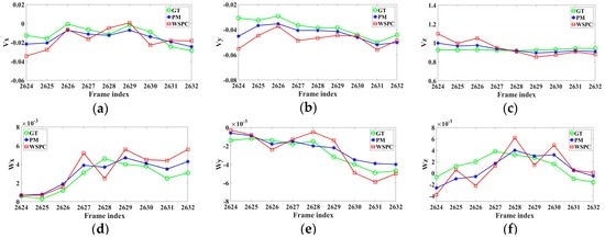 The ego-motion estimation error is expressed by the average translation error (ATE) and the average rotational error (ARE) [23]. The comparison results of PM and WSPC for scenario 1 are shown in Table 2. It can be seen that the PM method is much better than the WSPC method.