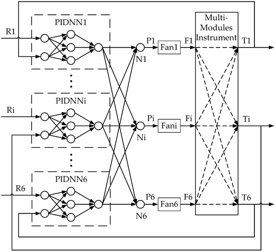 The proportional–integral–derivative neural network (PIDNN) controller is independent of system modeling, and it is suitable for fan speed control [15,16,17]. Lee et al. [15] presented a PIDNN controller for a server fan cooling system. Rossomando et al. [16] used an adaptive neural PID controller for mobile robots’ trajectory tracking control. Maraba et al. [17] introduced a PIDNN-based speed control method for an asynchronous motor. To control a MIMO coupling fan cooling system, PIDNN controllers were used separately and thus could not deal with the coordination among the fans, which degraded the effectiveness of the control.