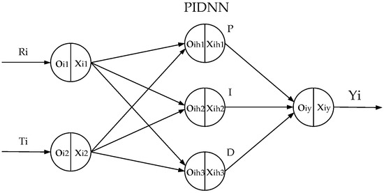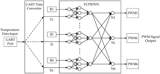 As mentioned above, the PIDNN controller does not rely on the object’s model. The structure of the PIDNN controller is a three-layer network whose hidden layer neurons’ activation functions work as a PID controller [15,16,17]. The improved FCPIDNN controller proposed in this paper takes a series of PIDNN controllers as basic controllers and adds a full connection layer between the basic controllers and the cooling fans.