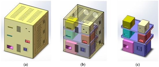 (a) The appearance of the instrument; (b) The perspective view of the 3D model with six modules inside and six cooling fans at the backplane; (c) The internal configuration of the instrument.