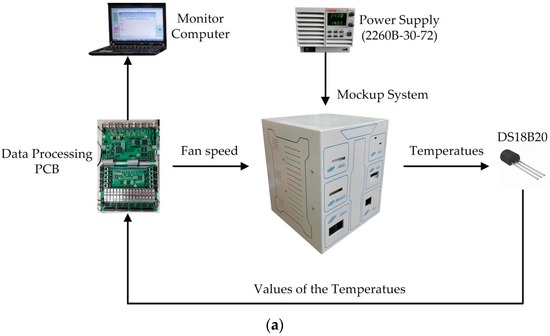 The mockup is 350 mm × 350 mm × 415 mm in volume with six modules inside. These modules have different shapes and volumes. Inside each module, there is a heater to generate heating and a small ventilation fan. The six heaters have different power, and the ventilation fans drive the heat out of the modules into internal public space of the mockup. Each module has a temperature sensor around itself, and there are six main cooling fans set at the back of the mockup. These cooling fans serve as temperature-tuning actuators to modulate the internal temperature of the instrument. Therefore, a temperature sensing and control system is built up with the modules, temperature sensors, and cooling fans.