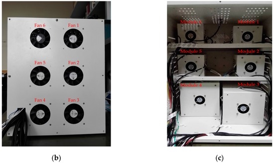 The temperature sensing and control system was applied to a mockup of an instrument with multi-modules, as illustrated in Figure 4a. The instrumentation includes a mockup, a power supply (KEITHLEY 2260b-30-72), a temperature sensors (DS18B20) array, a tailor-designed data processing circuit, and a data monitoring computer. The system used the FCPIDNN controller mentioned above to perform the online temperature control. The details of the mockup have been presented previously. Figure 4b shows the back view of the mockup, with six fans indicated as fan1 to fan6. Figure 4c shows the internal layout of the mockup. The power supply was used to provide electrical energy to the heaters inside the six modules, simulating the heating behavior of the modules. The powers of the heaters inside modules 1 and 6, modules 2 and 3, and modules 4 and 5 are set to 24W, 48W, and 96W, respectively. The temperature sensors were used to detect the local temperatures around the six modules. The data processing circuit, including a field-programmable gate array (FPGA, EP2C35F484), acquired the temperatures around the six modules from temperature sensors through universal asynchronous receiver and transmitter (UART) port, implemented the developed self-tuning temperature control and outputted the PWM control signals to the fans. The data processing circuit also output the temperature information to the data monitoring computer through the UART port.
