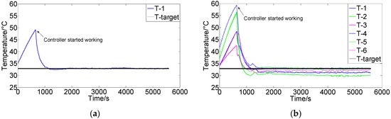 (a) Control results of a PIDNN controller for single module; (b) Control results of six separate PIDNN controllers for the six modules (Target temperature is 33 °C).