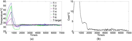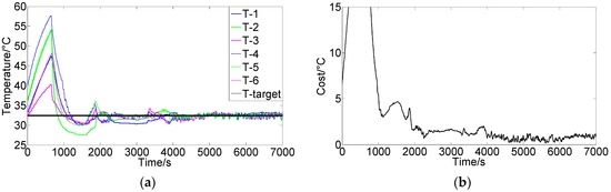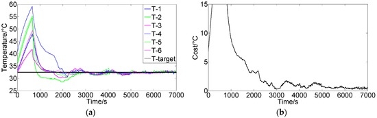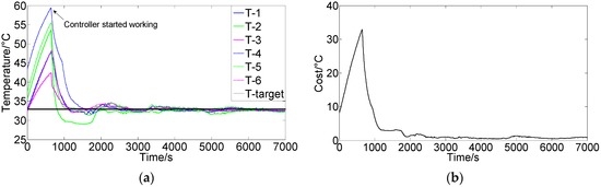 Figure 7a shows the results using the FCPIDNN controller. The experimental condition was the same as that in Figure 6a. Figure 7b shows the corresponding variation of the square root of the cost function. We can see that the temperature of different modules tended to the setting targets simultaneously, and the cost function’s variation shows that the difference between the actual and target temperatures decreased and approached the minima. There were no steady-state errors in the temperature, and the control obtained a global convergence.