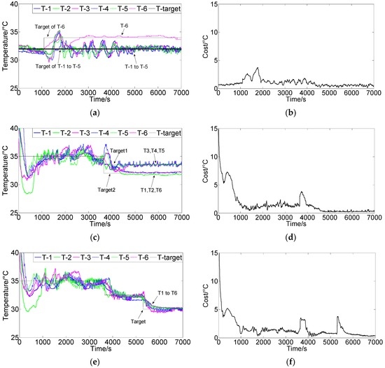 Figure 8 shows the control results using FCPIDNN controller when target temperature varied in process. There were three different control processes. Figure 8a,b (process 1) shows the control results when one temperature control target changed in a stable state. In the process, six controllers maintained the six modules’ temperature at 32 °C at the beginning. Then, the target temperature of module six was changed to 34 °C, and others’ temperatures remained unchanged. After a period of self-tuning by the FCPIDNN controller, the temperatures of all modules approached to their own targets, and the cost function gradually reduced to the minima. Figure 8c,d (process 2) show another control result when temperature target changed to different values. In the process, the temperature initially remained at 35 °C. Then, the target temperature for modules 1, 2, and 6 was changed to 33.5 °C, and the target temperature for modules 3, 4, and 5 was changed to 32 °C. After a period of self-tuning, all modules approached their target temperatures separately. Figure 8e,f (process 3) shows the control results when the target temperature for all modules was changed twice in the process; i.e., 35 °C at the beginning, then changed to 32.5 °C, and finally changed to 30 °C. The FCPIDNN controller successfully modulated the temperature of the modules to the setting targets and the square roots of the cost function got to minima at last.