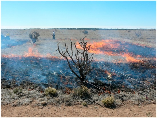 Our experiment site was located on the Corona Range and Livestock Research Center, Torrance County, NM, USA (UTM 13 S 463655 E 3793075 N) at 1870 m above sea level. The ranch is operated by New Mexico State University for range and animal science research and teaching purposes. The burn site vegetation and fuel was characterized as short-grass blue grama (Bouteloua gracilis) grassland with little to no shrubs outside of an occasional cholla cactus (Cylindropuntia imbricata). Average annual precipitation between 1990 and 2007 was 330 mm, with most of the rain falling between July and September. Average daily maximum air temperature is 10 °C during winter and 29 °C in summer. Average daily minimum air temperature is −3.9 °C in winter and 13.9 °C in summer [13].