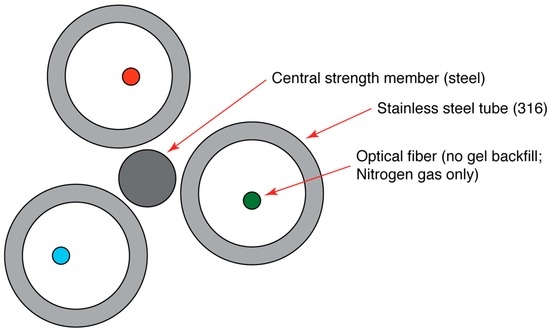 Cross-section schematic of custom-made fiber optic ‘fire cable’. Fire cable consisted of three hollow stainless steel capillary tubes twisted together around a central strength element. Each tube contained one 50/125-μm multi-mode optical fiber. Each fiber had a different coating: copper, polyimide and acrylate. No hydrogen scavenging gel was used for this cable. As such, contrary to the figure illustration, it is likely the optical fibers were in contact with the stainless steel wall of the capillary tubes for much of the length of the cable. Nitrogen gas was pumped through the stainless steel tubes during prescribed fires. Fire cable was constructed by AFL Telecommunications.