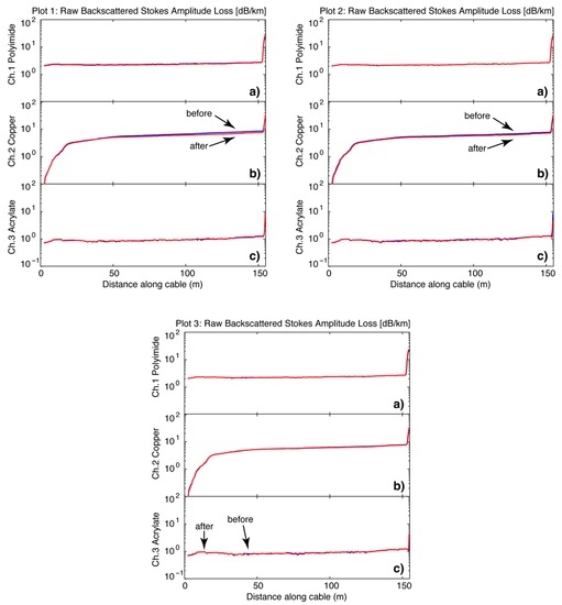 Attenuation (dB/km) between raw DTS data (backscattered Raman Stokes frequency amplitude) before (blue) and after (red) each burn in plot 1, 2, and 3 for (a) Polyimide coated fiber; (b) Copper coated fiber; and (c) Acrylate coated fiber. The first 50 traces of the Stokes signals are averaged together, and the last 50 traces after each burn are averaged together and plotted together. There is little to no change in attenuation after each burn.