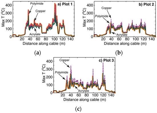 Maximum fire cable temperatures as recorded by DTS technology by distance (m) for polyimide (thicker, orange), copper (dashed purple), and acrylate (green) optical fiber coatings from (a) Plot 1 (Max = 421.9 °C on copper); (b) Plot 2 (Max = 223.2 °C on copper); and (c) Plot 3 (Max = 395.2 °C on copper). Calibration bath locations were as follows: ice baths at 7–15 m and 146–154 m, and ambient temperature baths at 16–24 m and 137–145 m. Head, back and flank fires were as follows: 30–73 m, 85–112 m, and 118–130 m, respectively. Fire cable that was outside the fire line was as follows: 0–29 m, 74–84 m, 113–117, and 131–154 m.