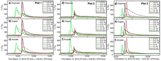 Fire cable temperatures (°C) as recorded by DTS technology (dashed lines) and thermocouples (solid lines) during three prescribed fire at distances of 55, 100, and 123 m along the cable. Data from the three burns (i.e., plots 1, 2, and 3) were recorded from optical fibers with polyimide (a,d,g), copper (b,e,h), and acrylate (c,f,i) coatings. Head (55 m), back (100 m) and flank (123 m) fires were used to burn plots.