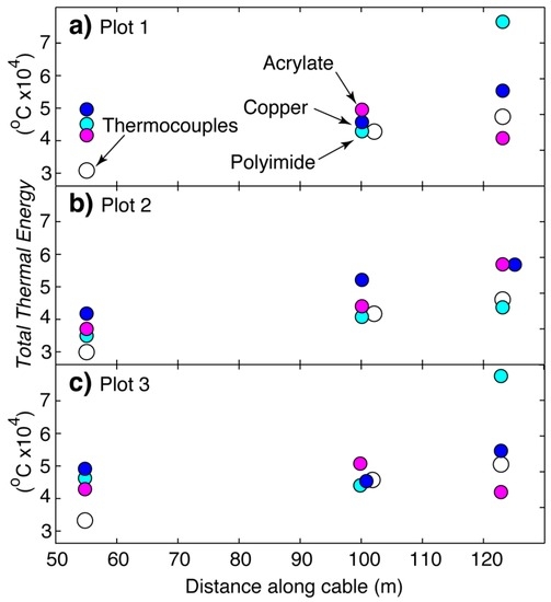 Total thermal energy measured for thermocouple and optical fiber temperatures (°C) from (a) Plot 1; (b) Plot 2; and (c) Plot 3 at distances along the cable of 55 (head fire), 100 (back fire) and 123 (flank fire) m.