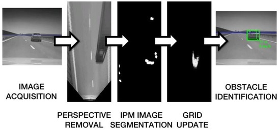 Monocular obstacle detection faces multiple challenges, the most important being that there is no direct 3D information, and no direct, geometrical way of separating the obstacles from the road features, or the closer obstacles from the background. For the identification of the obstacle regions in the image, solutions include region segmentation [6,7], motion based analysis [8,9], or appearance analysis, either through heuristics such as symmetry [10,11], or through the use of machine learning [12,13]. For extracting the 3D position of the obstacle, monocular vision uses constraints imposed on the structure of the environment, such as the condition that the road is flat, which leads to the measurement of the points on the road by Inverse Perspective Mapping (IPM) [14,15].