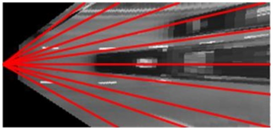 In the IPM image, an upright obstacle has the tendency to expand radially from the camera. We use this property to scan the IPM image with rays for each angular degree of the field of view, with each ray converging on the camera position point (Figure 3).