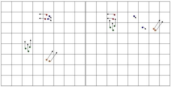 The first step of the algorithm is the prediction, which is applied to each particle in the set. The positions of the particles are altered (see Figure 6) according to their speed (or we can say that the particles move according to their own speed vector), and to the motion parameters of the ego vehicle (speed and yaw rate), read from the mobile device’s sensors, GPS and accelerometer/gyroscope. In addition, a random amount is added to the position and speed of each particle, for the effect of stochastic diffusion, modelling the uncertainty of the motion model with respect to the real-world movement of the obstacles. The second step is the processing of measurement information. This step is based on the raw occupancy cells provided by processing the IPM image, and provides the measurement model for each cell.