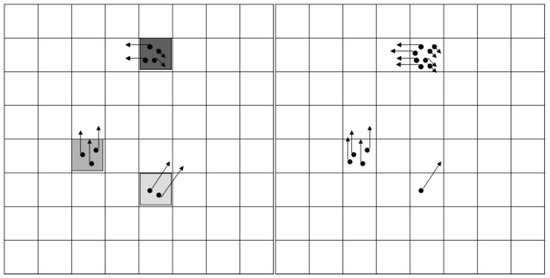 Weighting and resampling: The weight of the occupied hypothesis is encoded in the darkness of the cell of the left grid. In the right grid, the effect of resampling is shown, as particles are multiplied or deleted [16]. © 2011 IEEE. Reprinted, with permission, from IEEE Transactions on Intelligent Transportation Systems, Vol. 12, No. 4.