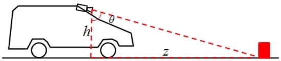 The process of estimating the distance of an obstacle from the camera when using IPM images is described in Figure 8. The height of the camera is known, along with its orientation. A pixel in the image corresponds to a line from the camera, which makes with the vertical the angle θ. This angle depends on several factors: the angle between the camera’s optical axis and the vertical, the position of the pixel in the image plane, the focal length of the camera, and the position of the principal point. We are not concerned with these details. For all practical purposes, we can say that we know θ, and thus, from the red triangle described in Figure 8, we can compute z.