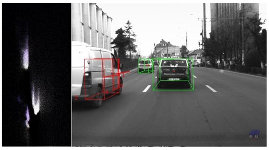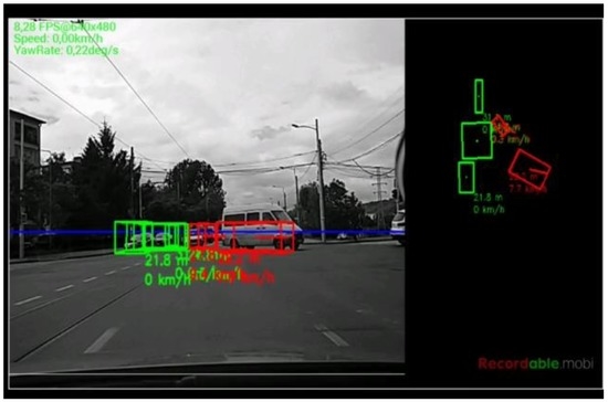 The resulted objects have length, width, orientation and speed, and can be therefore classified into static and dynamic. The process is seen in Figure 9, where the stationary vehicles are shown in green, and the moving vehicle is shown in red.