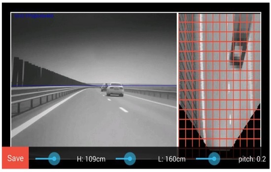 The calibration process is simplified by the automatic retrieval of the camera’s horizontal and vertical field of view angles using the Android API. The fixed image resolution of 640 × 480 pixels, combined with the known field of view, give us the focal distance in pixels. The position of the principal point is assumed to be in the center of the image. The user is asked to tune the pitch angle and the camera height, while the IPM image is shown with a distance grid superimposed, so that the user can adjust these parameters until top view scene is in accordance to the grid.