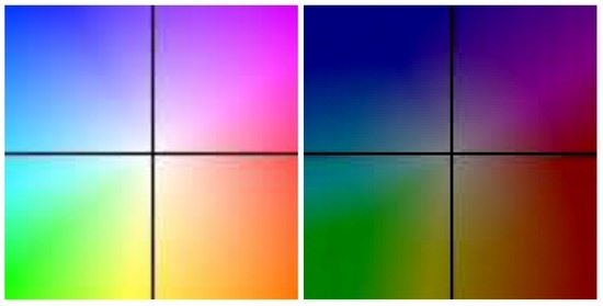 Color coding for occupancy grid speed vectors (full and half occupancy). The hue represents the direction (i.e., red means the obstacle cell is moving to the right), the saturation represents the speed magnitude, and the intensity represents the occupancy probability of the grid [16]. © 2011 IEEE. Reprinted, with permission, from IEEE Transactions on Intelligent Transportation Systems, Vol. 12, No. 4.