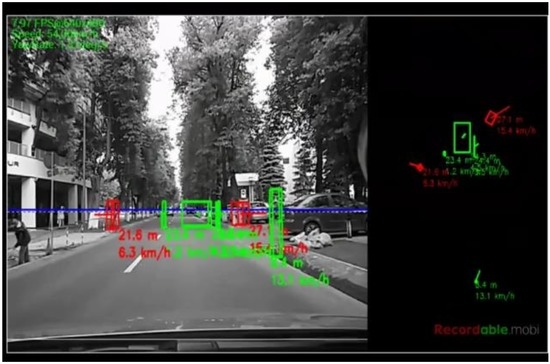 (Left) Detected incoming vehicle, at a relative speed of around 100 km/h; and (Right) diagonally crossing object, on patched road. The uneven road surface does not impede detection.