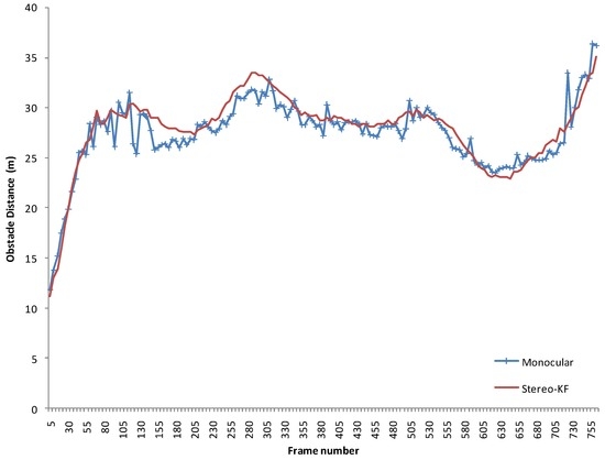 The range estimation results are shown in Figure 21. While noisier, the estimations of the monocular system follow closely the stereovision results. For the whole sequence, the Root Mean Square Error was 1.33 m, and the Mean Average Error 1.02 m.