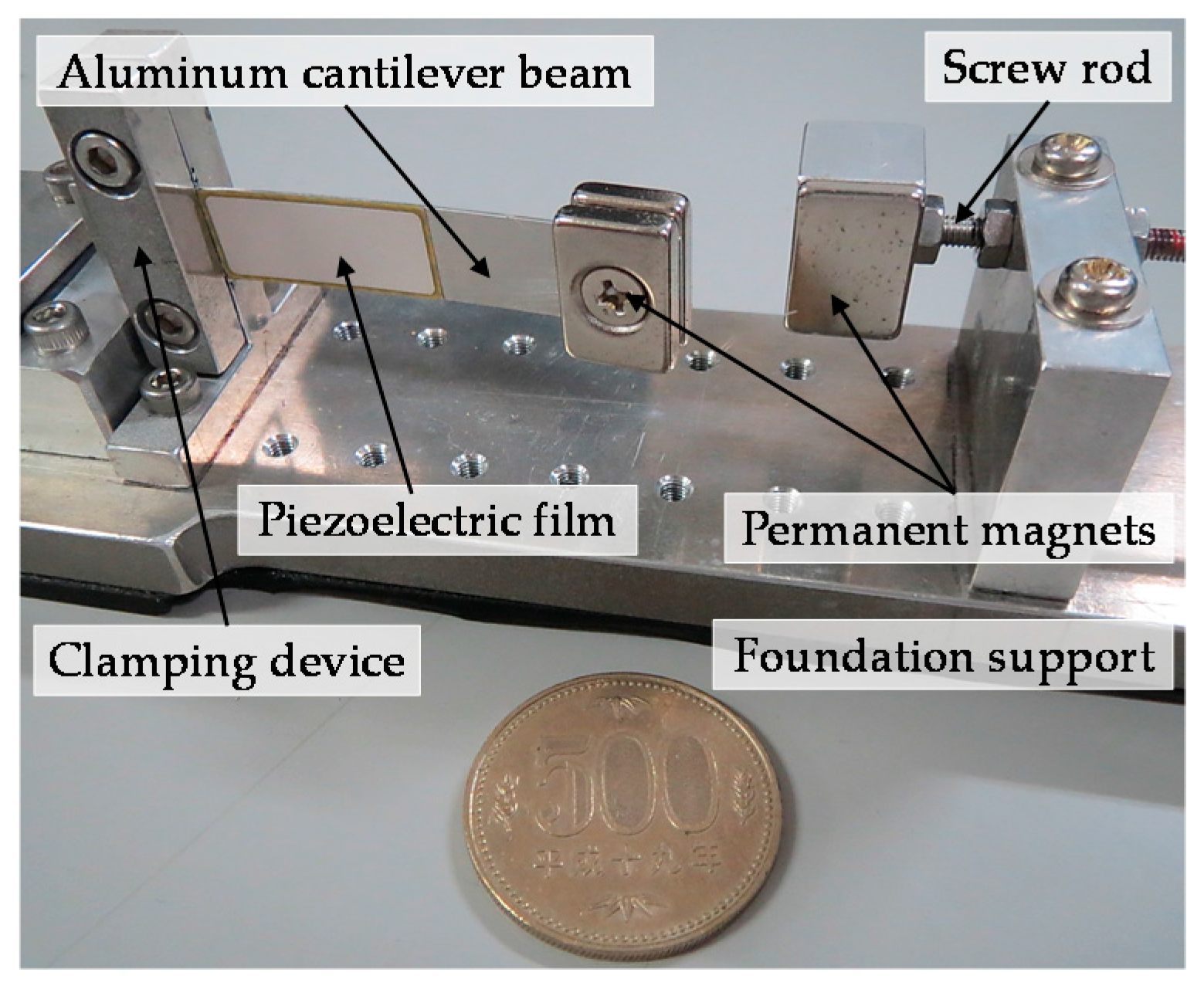 The energy harvester consists of a 42 mm × 10 mm × 4 mm aluminum cantilever beam and an adjustable screw rod for adjusting the distance between two magnets. The magnetic tip mass comprises two identical neodymium magnets (NSC0010, Miyagi, Japan) with dimensions of 15 mm × 10 mm × 3 mm and a permanent magnet (NS0093, Miyagi, Japan) with dimensions of 15 mm × 10 mm × 2 mm. Ultrathin unimorph ceramic piezoelectric material (K2512U1, THRIVE Corporation, Saitama, Japan) with dimensions of 22.9 mm × 10 mm × 0.1 mm was selected to paste on the root segment of the beam, and its electrostatic capacitance is 115 nF. The N/S pole of the magnets is still kept in the