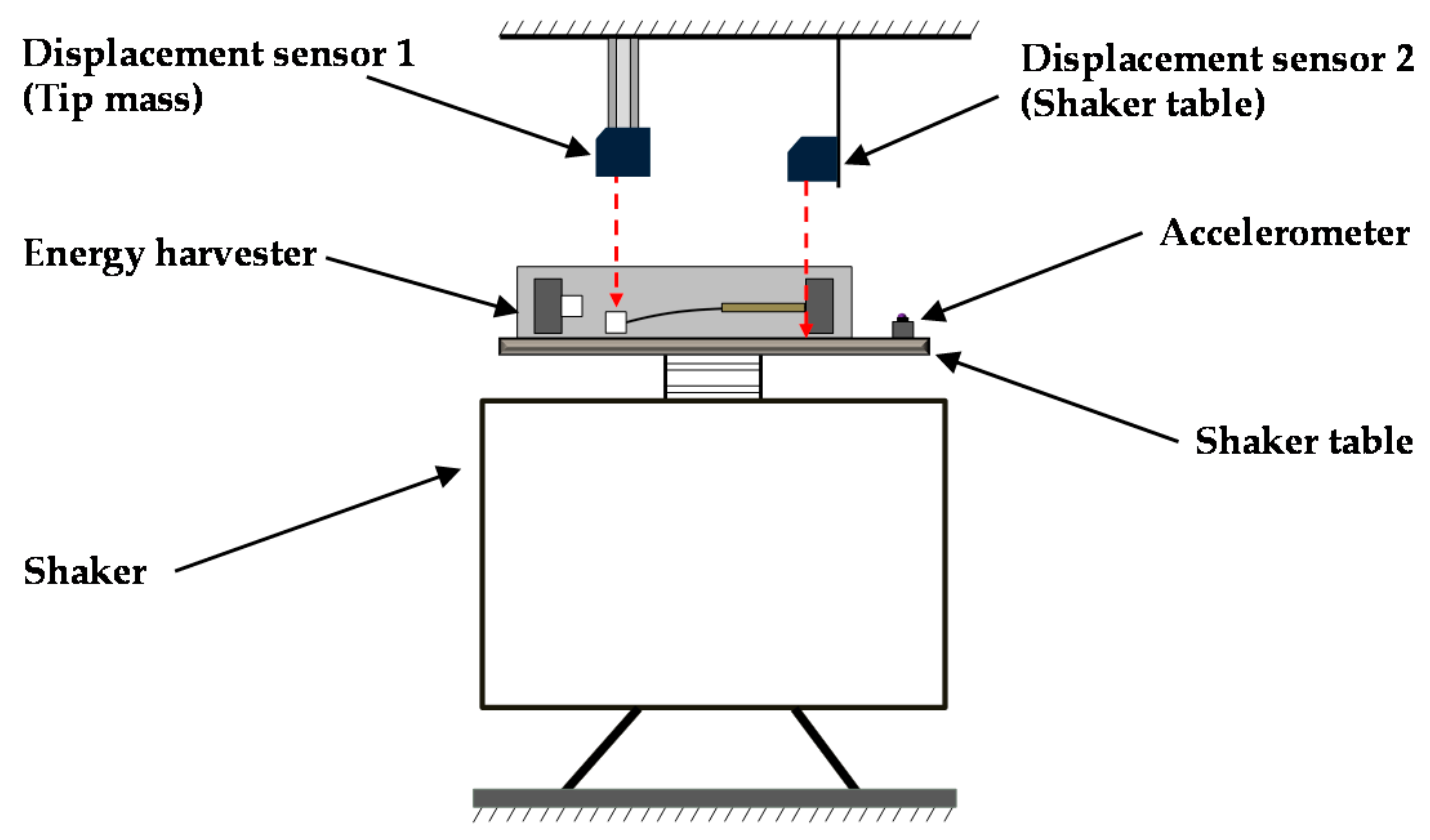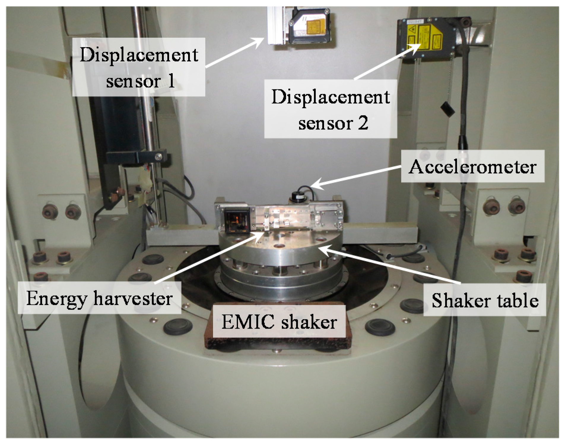 Figure 5 presents the experimental setup. The energy harvester system is fixed on the shaker table, displacement sensors 1 and 2 are set to measure the vibrational amplitudes of the magnetic end mass and shaker table, respectively, and the acceleration sensor is assembled to detect the vibration acceleration of the shaker table. An overview of the experimental setting is shown in