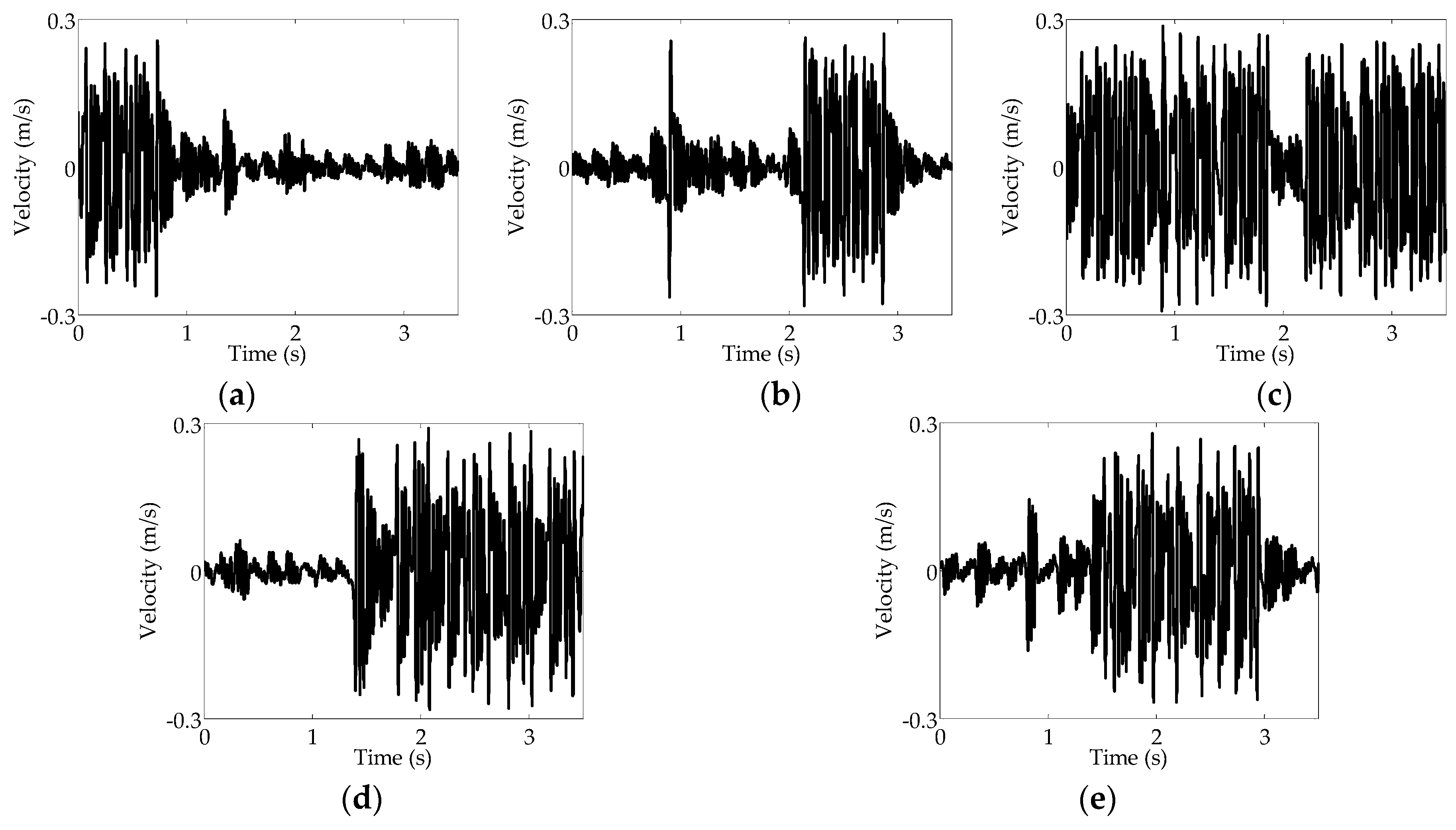 Velocity responses under the on-road noise excitation and the periodic gravity force at the angular frequencies: (a) 33 rad/s; (b) 35 rad/s; (c) 38 rad/s; (d) 40 rad/s; (e) 42 rad/s.